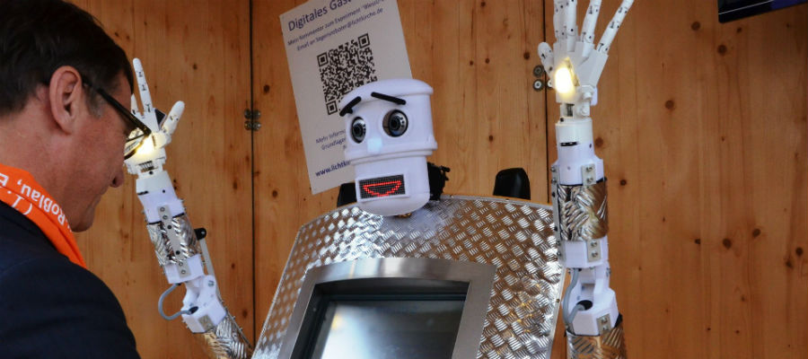 Meestal zijn het standaard zinnetjes die priesters of dominees uitspreken om je te zegenen. Kunstmatige intelligentie kan deze riedeltjes ook makkelijk opdreunen, lijken ze in Wittenberg te denken. In een kerk in deze Duitse stad staat namelijk sinds kort een – niet al te spectaculaire – robot die de rol van geestelijke op zich neemt.