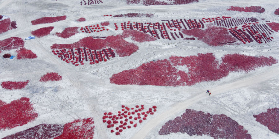 Van alle landen die hete pepers verbouwen, staat China met stip op één. In dit stuk woestijn ligt een klein deel daarvan te drogen.