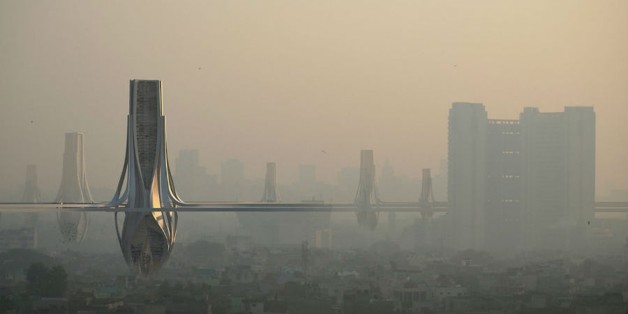 Het in Dubai gevestigde architectenbureau Znera heeft een oplossing voor ogen: de skyline van Delhi verrijken met meerdere smog-filters. Oftewel een netwerk van torens dat de vieze lucht absorbeert en schone lucht vrijgeeft.