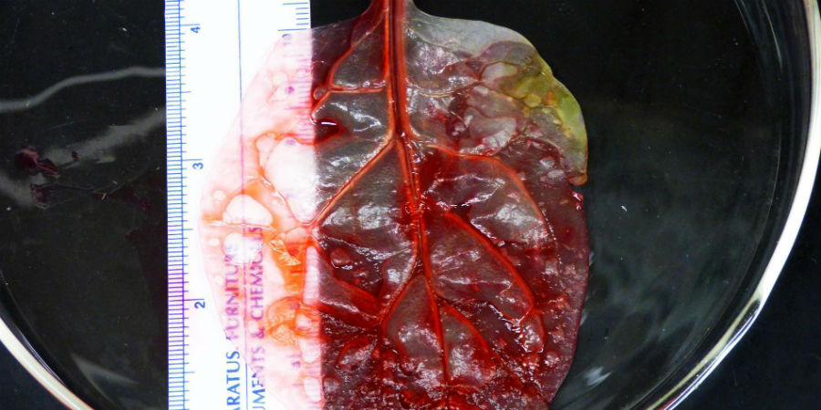 Makkelijker gezegd dan gedaan. Allereerst moesten de onderzoekers de plantencellen verwijderen uit de spinaziebladen. Hierbij moest het vasculaire systeem intact blijven. Om dit te vergemakkelijken, wasten ze de bladen met een speciaal detergent, waardoor ze van groen naar doorzichtig wit kleurden.