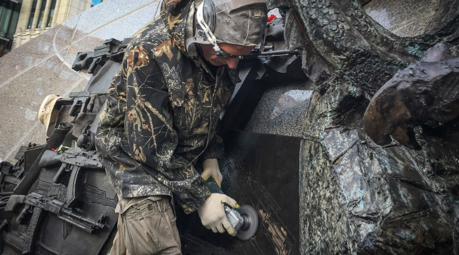 Maar drie dagen later moest het beeld alweer worden aangepast, want er was een merkwaardige fout gemaakt. Op de sokkel van het sculptuur stond namelijk een Duits geweer afgebeeld.