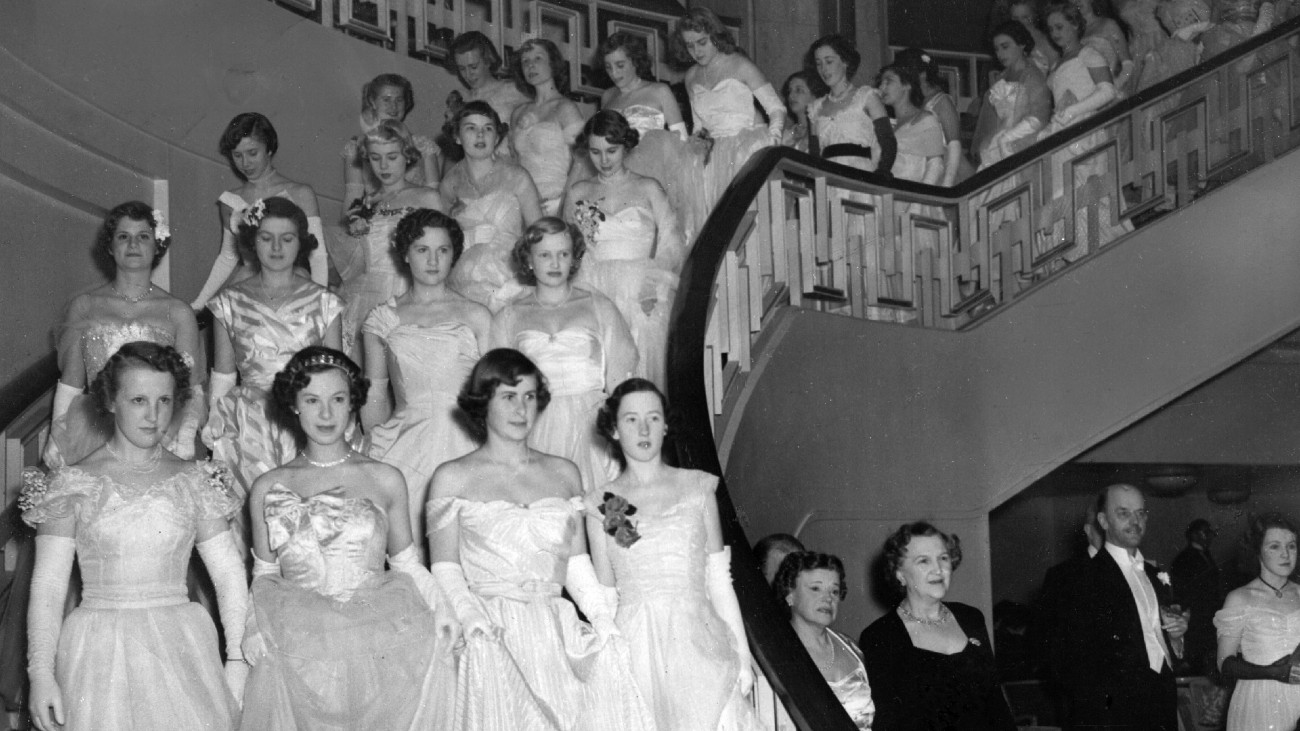 Gelukkig is de oorsprong niet zo letterlijk. De uitdrukking komt uit de VS, en is waarschijnlijk in de jaren zestig ontstaan uit een combinatie van twee andere zegswijzen. Ten eerste dat ‘coming out’. Welgestelde meisjes deden dit wanneer ze voor het eerst naar een bal gingen (zie de foto). Deze zogeheten debutantes werden voorgesteld aan de rest van de high society, die zo kon zien of er huwelijksmateriaal voor zoonlief tussen zat.