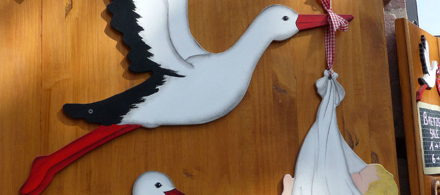 Echt realistisch is het verhaal immers niet. Een pasgeboren baby weegt 3 à 4 kilo en een volgroeide ooievaar komt daar qua gewicht aardig bij in de buurt. Een hele opgave dus om zo’n zuigeling de lucht in te krijgen, en al helemaal op de manier waarop het tafereel altijd staat afgebeeld: de baby bungelend in een doek aan het puntje van de snavel, met uitgestrekte nek.