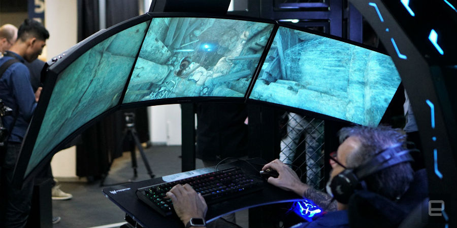 Het pronkstuk van Acer lijkt niet zozeer op een meubel als wel op iets dat je in een gamehal aantreft. De game-troon is 1,5 meter hoog en heeft een ergonomische stoel die tot 140 graden kan worden gekanteld. De stoel is gemotoriseerd en kan zelfs trillen.