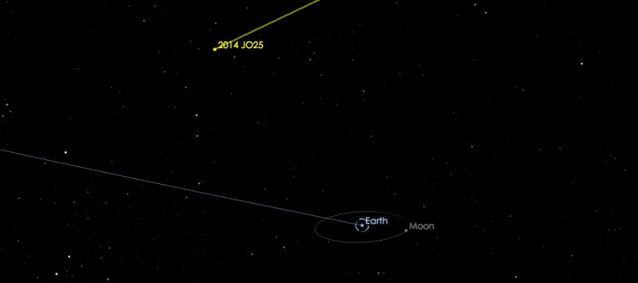 Een joekel van een asteroïde zal vanmiddag na 400 jaar weer dichtbij onze aardbol komen. Met een lengte van zo’n 650 meter kan asteroïde 2014 JO25 de aarde heel wat schade aanrichten. Maar – geen paniek – de ruimtesteen zweeft voorbij op een veilige afstand van 1,8 miljoen kilometer. Dat is ongeveer vijf keer de afstand tussen de aarde en de maan.