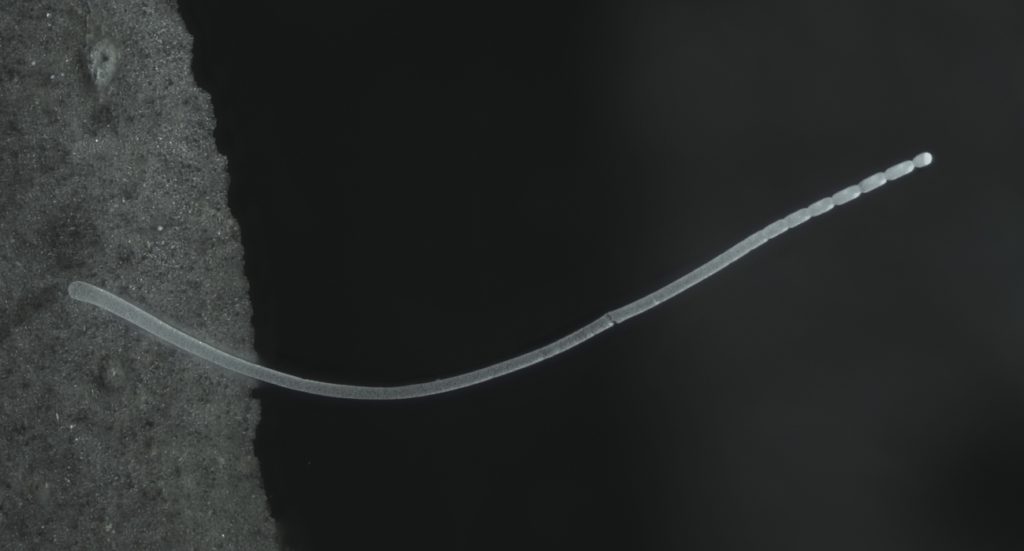 Zijn eerste gedachte ging uit naar een meercellig organisme, zoals een schimmel. Maar eenmaal onder de microscoop bleek dat het toch echt om één cel ging waar ‘tentakels’ van 1 centimeter lang uitstaken. Een bacterie dus.