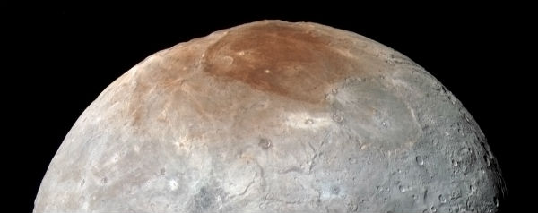 Charon blijkt geen saaie bol met hier en daar een krater en verder niets. Vroege beelden lieten al zien dat de maan beschikt over een systeem van kloven dat langer en dieper is dan de Grand Canyon; bovenstaande foto toont dat gebied in veel meer detail. Mogelijk loopt de canyon ook aan de andere kant van de maan nog door.