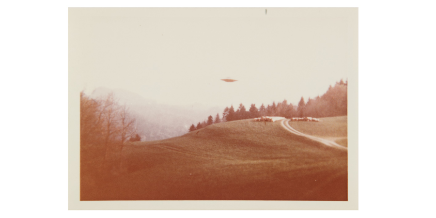 Op de eerste set foto’s lijken drie UFO’s boven het Bachtelhörnli-gebergte in Zwitserland te vliegen. Meier maakte de kiekjes 28 maart 1976. © Sotheby’s