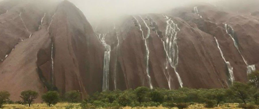 Meestal lijkt de rotsformatie Uluru in Australië, ook wel bekend als Ayers Rock, op een droge steen. Maar afgelopen weekend was dit wel anders. De rots kreeg deze kerst te maken met 23 centimeter regen in 24 uur. Meer dan Uluru is gewend; het water sijpelde van de rots af. En dat zorgde voor mooie beelden.