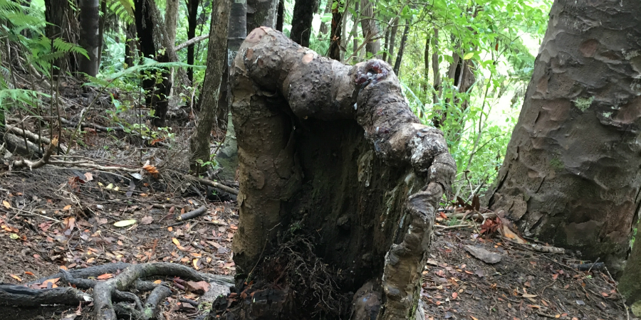 De onderzoekers, verbonden aan de Auckland-universiteit, spotten de levende stronk in een bos in Nieuw-Zeeland. Er moest iets bijzonders mee aan de hand zijn. Zonder bladeren kon de ooit grote boom een van de belangrijkste processen bijvoorbeeld niet meer uitvoeren; het maken van suikers middels fotosynthese.