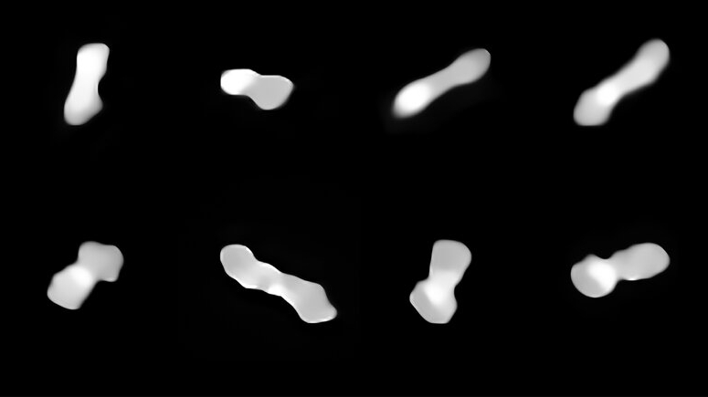 Met kiekjes van de tuimelende planetoïde (zie afbeelding hierboven), genomen tussen 2017 en 2019, wisten de astronomen het meest gedetailleerde 3D-model van Kleopatra tot nu toe te maken. Het team schat de ruimterots op ongeveer 270 kilometer lang. Ook schatten ze de volume van het brokstuk.