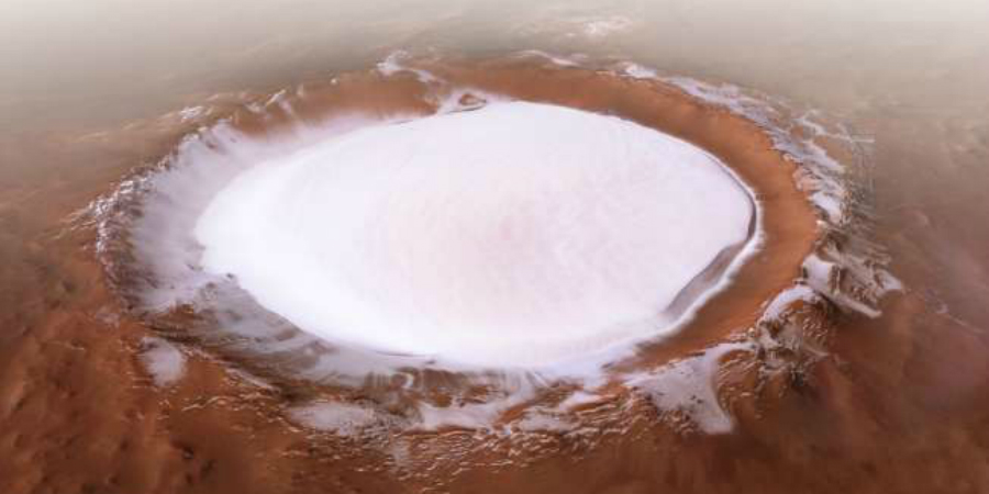 Het lijkt erop dat Mars wél een witte Kerst heeft dit jaar. Op een foto die de Europese Ruimtevaartorganisatie ESA onlangs vrijgaf, is de 82 kilometer brede Korolev-krater op de noordpool van de rode planeet te zien. En hoewel de krater gevuld is met een bijna twee kilometer dikke laag ijs – geen sneeuw – is het wel een erg leuk en winters plaatje.