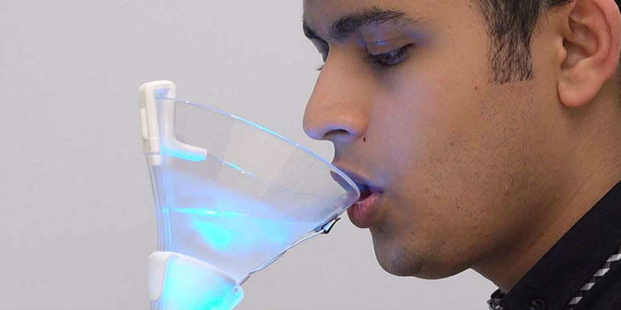 Op de rand van het Vocktail-glas zijn twee elektrodes bevestigd die, niet als bij de limonadebeker, de smaakpapillen ‘triggeren’. Ook zorgt ledverlichting voor de juiste kleur van het gewenste drankje.