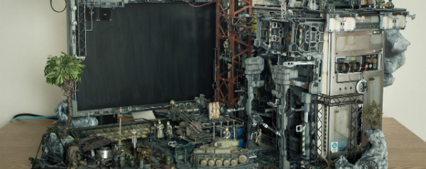 Echt handig werken is het niet en waarschijnlijk is hij ook verschrikkelijk moeilijk te onderhouden: deze computerkast, die eruit ziet als een slagveld uit een toekomstige Derde Wereldoorlog.