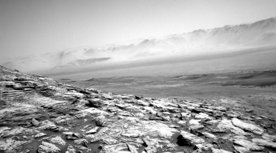 De rechter navigatiecamera van Curiosity schoot dit plaatje afgelopen vrijdag vanaf locatie Central Butte die zich in de Galekrater bevindt. Central Butte is een zogeheten voetvlakte; een flauw hellend oppervlak aan de voet van een berg of heuvel.