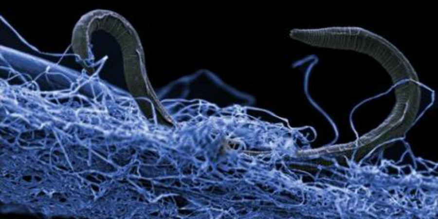 Rondwormen in een biofilm van micro-organismen. De eukaryoten zijn 1,4 kilometer onder het aardoppervlak gevonden. © Gaetan Borgonie (Extreme Life Isyensya, België).