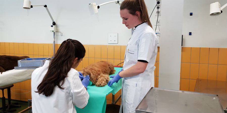 Het doel van vandaag: leren hoe je kortademige honden wat meer ademruimte kunt geven. Vooral mopshonden met een platte snuit krijgen vanwege hun bouw regelmatig te weinig lucht. En dus moeten de studenten diergeneeskunde aan de Universiteit Utrecht leren hoe ze dat kunnen verhelpen. Erg nuttig voor de nabije toekomst, want het duurt niet lang of de tien masterstudenten zijn gediplomeerde dierenartsen.