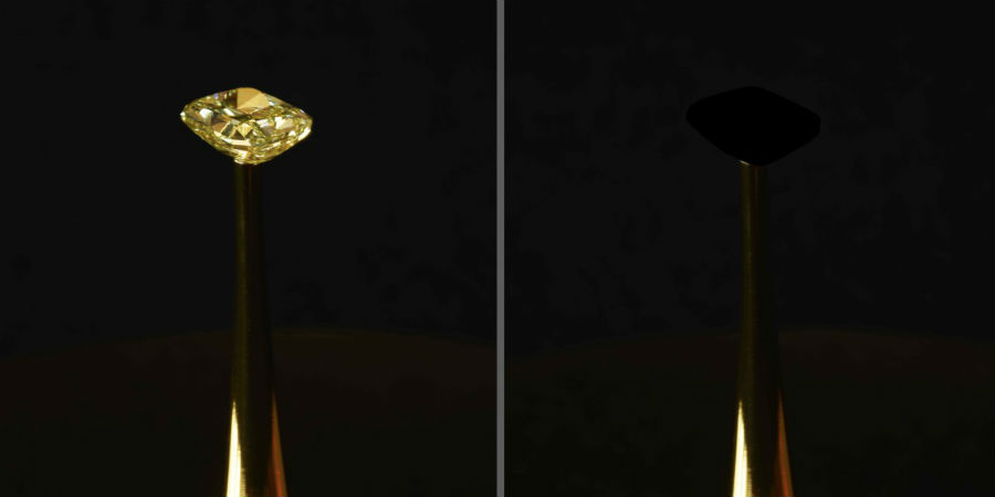 Om het materiaal te demonstreren, coatten de onderzoekers een gele diamant ter waarde van 1,8 miljoen dollar met het gitzwarte materiaal. In plaats van een glimmend 3D-object leek de diamant nu tweedimensionaal te zijn en verloor het überhaupt zijn facettenvorm.