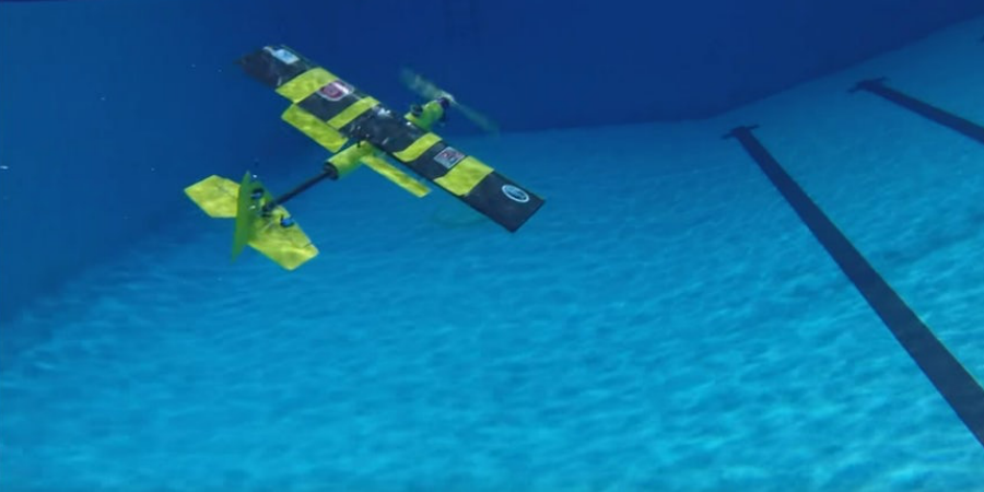 Deze drone, ontwikkeld door Amerikaanse onderzoekers, kan zich makkelijk door de lucht bewegen (what’s new?), maar is ook nog eens een kei in duiken.