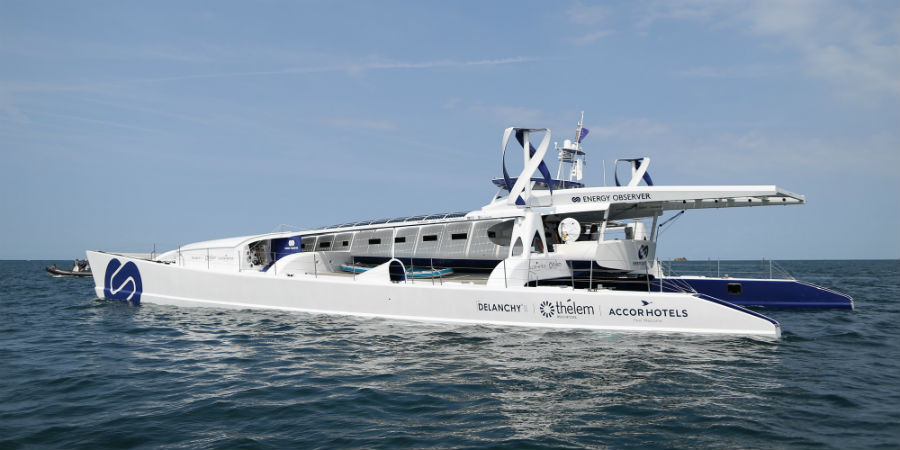 De Energy Observer, een 30 meter lange en 13 meter brede catamaran, heeft zijn brandstof altijd bij zich; het zeewater waar het doorheen vaart. Maar in eerste instantie wordt het schip aangedreven door elektromotoren die door zonne- en windenergie worden opgeladen. Staat er een keer geen wind of schijnt de zon niet, dan kan het vaartuig waterstof als brandstof benutten.