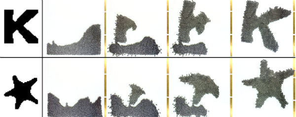 De wetenschappers bouwden relatief goedkope en simpele robots die volledig autonoom zijn. Ze zijn uitgerust met slechts één sensor: een infraroodsensor die de bots gebruiken om te communiceren met hun soortgenoten. Wanneer een paar Kilobots een sein krijgen om bijvoorbeeld de letter K te vormen, zenden ze via infrarood licht een signaal uit naar de andere robots. Met hun drie benen, die worden aangedreven door twee motoren, rangschikken ze zich vervolgens in de gevraagde letter.