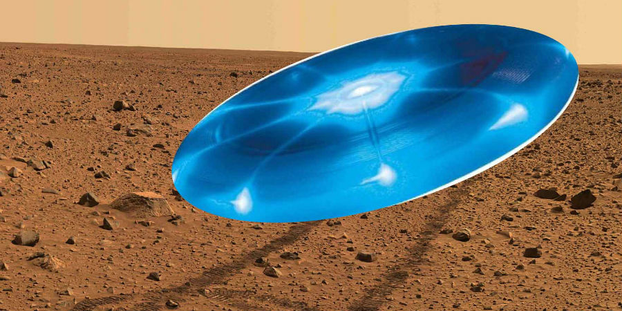 Nu de dichtheid. Die varieert op Mars nogal met de plaats en de hoogte, maar gemiddeld is hij maar 1 procent van die op aarde. Als we nu de minimale snelheid uitrekenen, blijkt de frisbee bijna zes keer zo hard te moeten gaan om in de atmosfeer van Mars te kunnen vliegen. Op aarde is de snelheid van een frisbee gemiddeld 14 meter per seconde, ofwel 50 kilometer per uur. Op Mars zou dat dus tegen de 300 kilometer per uur moeten zijn. Sneu voor de astronauten, maar dat zit er toch echt niet in.