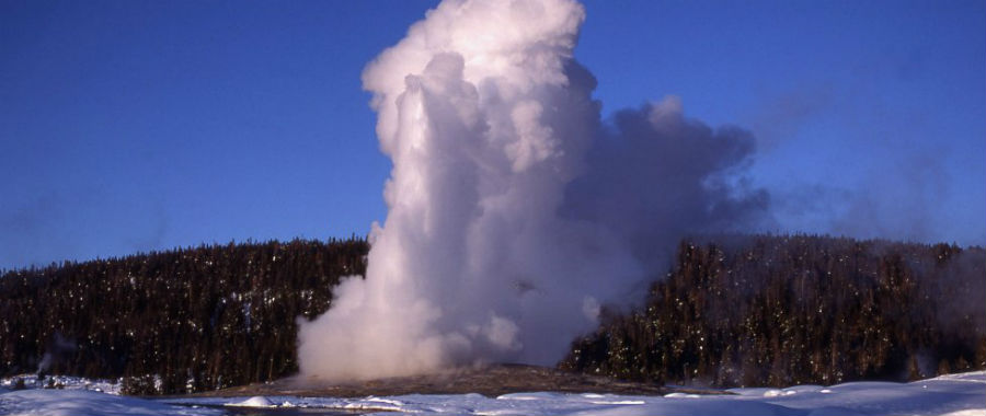 Een van de hoofdrolspelers in Yellowstone National Park is Old Faithful. Om de 74 minuten blaast deze geiser gloeiendheet water en stoom de lucht in. Maar door de kou in het park – temperaturen rond de -18 graden Celsius – spuwt Old Faithful geen water en stoom, maar sneeuw!