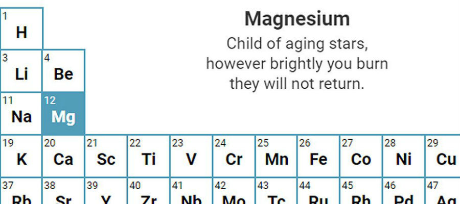 Wellicht dat je de elementen wel kan onthouden met behulp van ezelsbruggetjes. Wat dacht je van een kort gedicht over elk element? Want dat is precies wat de Britse fictieschrijfster en poëet Mary Soon Lee heeft gedaan. Zij schreef een haiku – een kort gedicht van drie regels waarvan de eerste regel 5 lettergrepen bevat, de tweede regel 7 en de laatste regel weer 5 – over elk element.