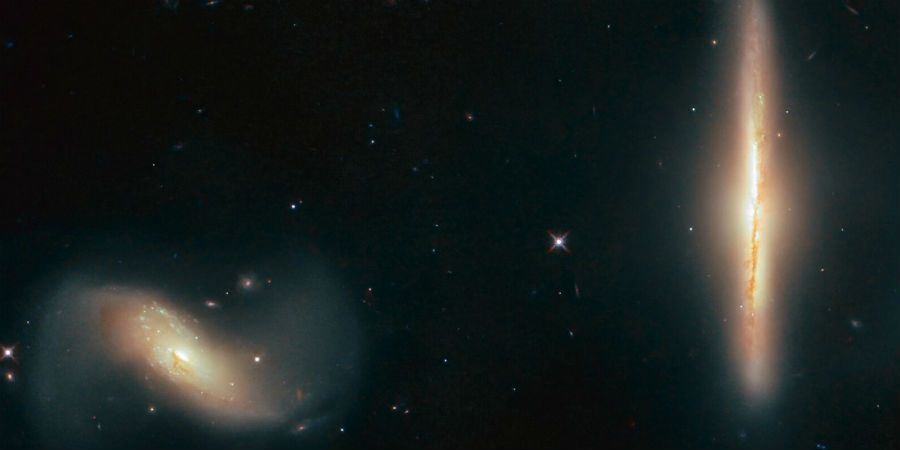 Sommige sterrenstelsels blijven ver uit elkaars buurt, terwijl andere gevaarlijk dicht bij elkaar komen. Van dat laatste is sprake als het aankomt op de stelsels NGC 6285 (links) en NGC 6286 (rechts), samen Arp 293 geheten, gelegen in het sterrenbeeld Draak.
