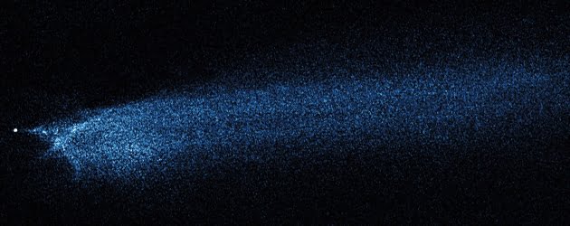 Ruimtetelescoop Hubble maakte een opname van een raar x-vormig object met een komeetachtige staart. Bij de NASA denken ze dat dat het gevolg is van een botsing tussen twee asteroïden.