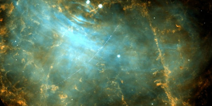 Nee, die streep op de foto is geen afwijking of foutje. We zien hier een asteroïde (of planetoïde) die door de Crab Nebula raast en in het vizier van NASA’s ruimtetelescoop Hubble is gekomen. Op het moment dat de foto werd genomen, bevond de asteroïde zich op een afstand van 165 miljoen kilometer van ons aardbolletje.