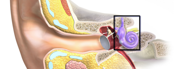 We kunnen een deel van de zorgen wegnemen: in principe zijn onhoorbare geluiden niet schadelijk voor het gehoor en je trilharen gaan er ook niet van trillen. Om uit te leggen hoe dat komt, moeten we Martijns biologieles even vervolgen. Geluid laat je trommelvlies trillen en drie minuscule botjes – hamer, aambeeld en stijgbeugel – brengen die trilling over naar de vloeistof in het slakkenhuis (zie de zwarte rechthoek in de afbeelding).