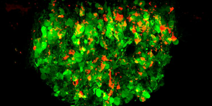 ‘Dorstneuronen’ in muizen gaan aan (groen en rood) wanneer sensoren in het maag-darmstelsel met zoute, niet-dorstlessende vloeistoffen in aanraking komen. © Knight Lab/UCSF/HHMI