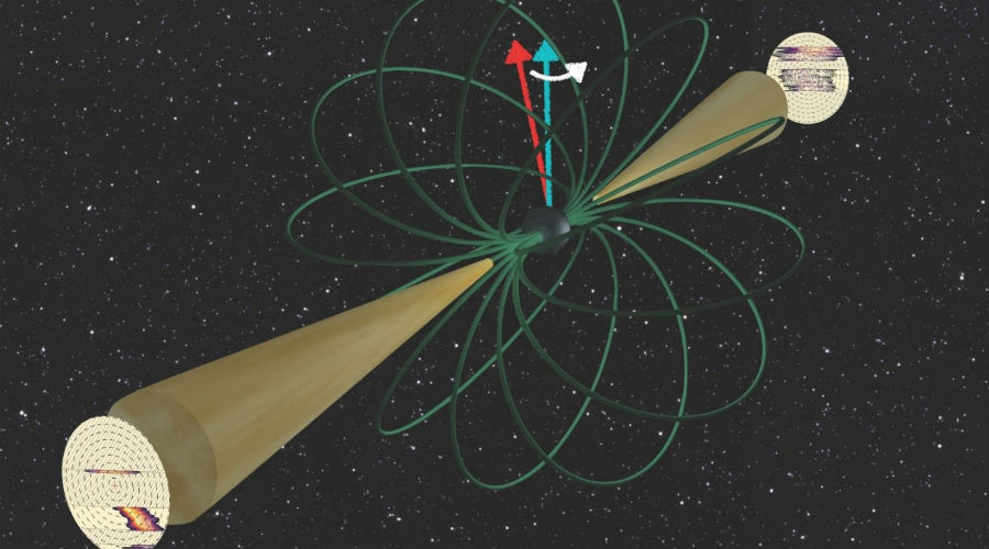 Net als bij onze aarde zijn de magnetische noord- en zuidpool voor het merendeel van de radiopulsars niet evenwijdig aan de geografische. “Vanaf Aarde zien we zodoende alleen radiostraling wanneer de bundel van de noord- of zuidpool van de pulsar naar de aarde gericht staat”, mailt astronoom Cees Bassa (ASTRON). “Bij sommige radiopulsars zijn de rotatie- en de magnetische as zo georiënteerd dat we radiostraling van beide polen van de pulsar kunnen zien. Dat is het geval bij de pulsar van dit artikel, al is dat niet wat hem speciaal maakt; bij een paar procent van alle radio pulsars is radiostraling van beide polen zichtbaar.”