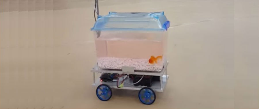 Een goudvis in een kleine kom kan natuurlijk nooit de wereld ontdekken. Dus wat doe je als je je zwemmende huisdier wel wilt laten reizen? Juist, dan bouw je een wagentje met sensors die voelen waar de vis is en op basis van zijn positie bepalen welke kant de kar op moet sturen. Toegegeven: het is niet echt een uitvinding die de wereld verandert, maar het blijft leuk.