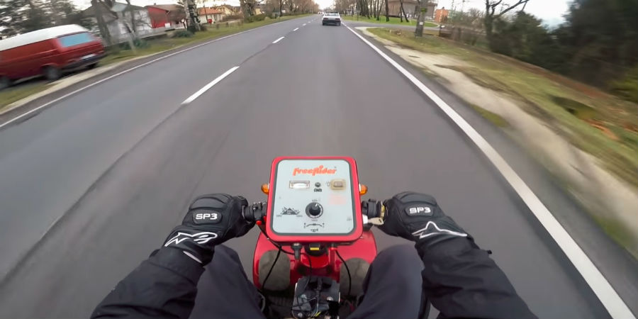 Heb je weleens gedacht: goh, die man gaat behoorlijk hard in zijn scootmobiel? Deze YouTuber doet daar nog een flink schepje bovenop. Hij gaf een elektrische scootmobiel een upgrade, waardoor het ‘saaie’ vervoersmiddel in een bad ass racemonster veranderde. Hij liet het apparaat zelfs racen tegen auto’s. Slim? Neuh. Vermakelijk om naar te kijken? Best wel!