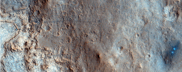Een camera aan boord van een Marssonde heeft van een hoogte van enkele honderden kilometers Marsrover Curiosity en zijn sporen gekiekt.