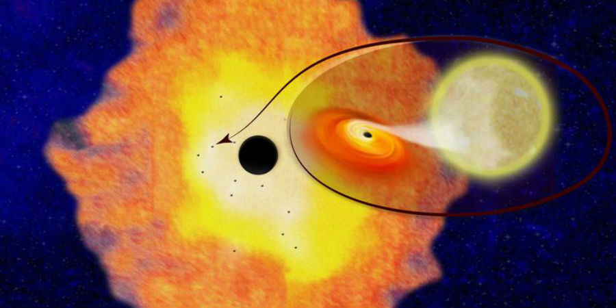 Wanneer een ster nabij zo’n zwarte reus ligt, wordt deze ernaartoe getrokken en gaat hij een baan om het gat beschrijven. Hierdoor ontstaat een platte schijf (zie onderstaande afbeelding). Doordat materie aan de binnenkant van de schijf sneller draait dan de verder gelegen lagen, ontstaat er wrijving. En die wrijving veroorzaakt röntgenstraling die vervolgens kan worden waargenomen met onder andere de Chandra-ruimtetelescoop.