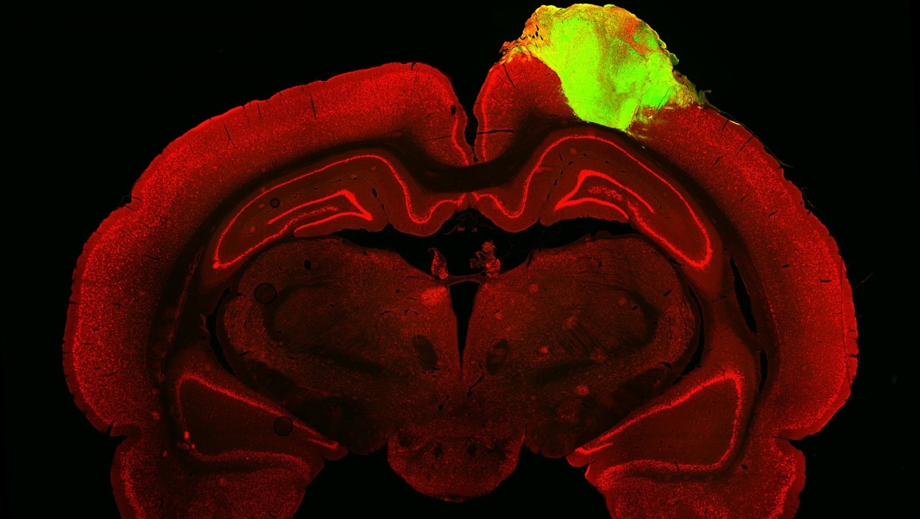 Beeld: Microscopische foto van de hersenen van een rat, met in groen de getransplanteerde menselijke breinorganoïde. (Foto door Gamadze et al. CC BY-SA)