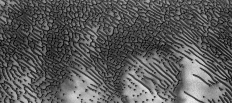 Je zou bijna denken dat marsmannetjes een boodschap aan aardbewoners proberen over te brengen. Maar helaas: het is niet het werk van aliens. Wat je op de foto ziet zijn donkere duinen op Mars, gecreëerd door Mars’ winden.