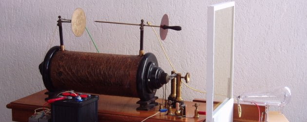 De ontladingen in de vonkbrug. Dit onderdeel meet de hoogspanning en zorgt ervoor dat die niet te hoog kan oplopen. De lengte van de vonken geven een idee van de spanning die heerst.