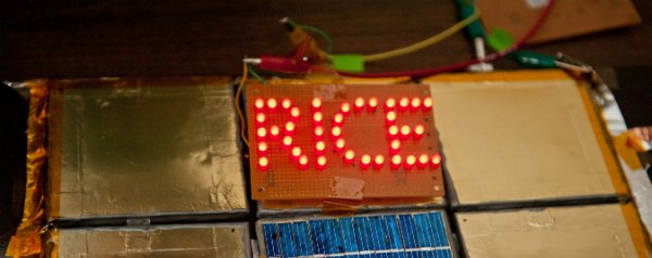 Het prototype van de accu levert 2,4 volt en kon de met LED-lampjes gevormde naam RICE zes uur lang laten branden.