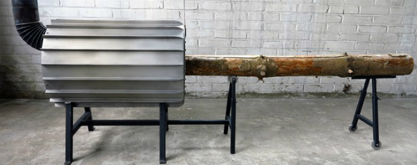 De kachel, de Spruce Stove genoemd, is een ontwerp van de Nederlanders Michiel Martens en Roel de Bohr. De boomstam naar binnen zeulen en op de speciale bok tillen is even een klusje. Maar vervolgens kun je hem, dankzij de rollen waar de stam op steunt en de wieltjes onder de bok, vrij gemakkelijk stukje bij beetje naar binnen schuiven.
