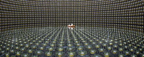 Het team van Kajita deed zijn baanbrekende werk al in 1998, met de Super-Kamiokande-detector (zie foto linksboven), die zich in een zinkmijn bevindt op 150 kilometer van Tokio en meer dan 50.000 ton water bevat. Hiermee stelden onderzoekers vast dat neutrino’s die ontstaan als deeltjes uit de ruimte (kosmische straling) op de aardatmosfeer botsen, niet van identiteit veranderen als ze direct van boven komen, maar dat wel doen als ze eerst helemaal door de aarde hebben moeten reizen voordat ze het experiment bereikten.