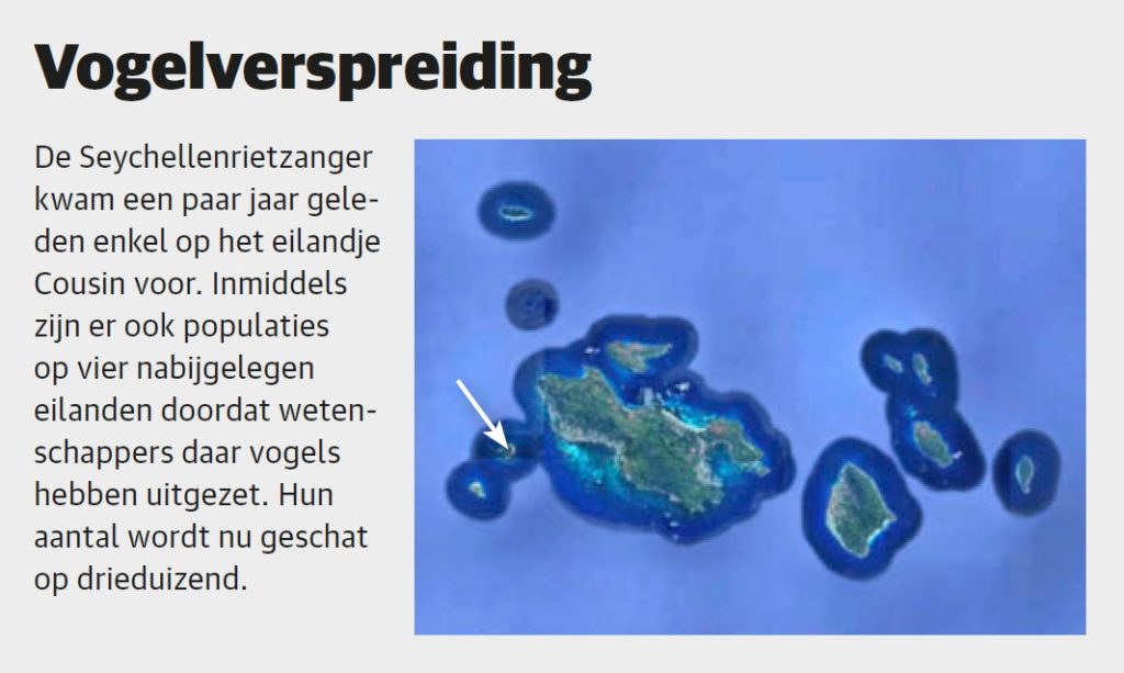 Dat een vrouwtje per broedsel maar één ei legt, helpt ook niet erg. “Om de vogels te redden, kochten een paar vogelbeschermingsorganisaties het eiland en maakten ze er een natuurreservaat van.” Ze lieten de kokospalmen kappen en brachten de natuurlijke vegetatie terug. Hammers: “Al snel werd duidelijk dat als je de condities voor de Seychellenrietzanger geschikt maakt, de populatie door het dak gaat.” Binnen tien jaar was het aantal vogels op Cousin meer dan vertienvoudigd.