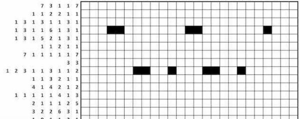 - Elke rij of kolom is voorzien van een aantal cijfers. Deze geven de lengte van reeksen opeenvolgende zwarte vakjes aan. Een voorbeeld: ‘2 1 6’ verwijst naar respectievelijk twee, een en zes zwarte vakken achter elkaar. Deze zwarte rijen moeten worden gescheiden door ten minste een wit vak.