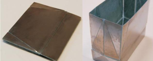De ingenieurs bedachten een vouwpatroon en toonden aan dat hun stalen tas kon worden opgevouwen tot een plat pakketje, simpelweg door in de hoeken te drukken. Hoewel zij voor hun prototype staal hebben gebruikt, zouden andere onbuigbare materialen, zoals karton, even goed moeten werken.