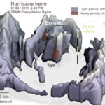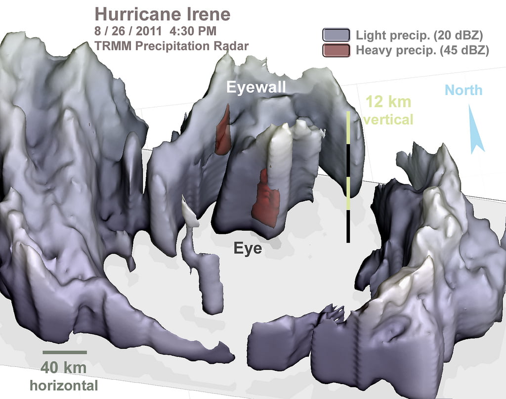 - De kern van orkaan Irene, zoals vastgelegd door de Tropical Rainfall Measuring Mission-satelliet van de NASA op 25 augustus 2011.