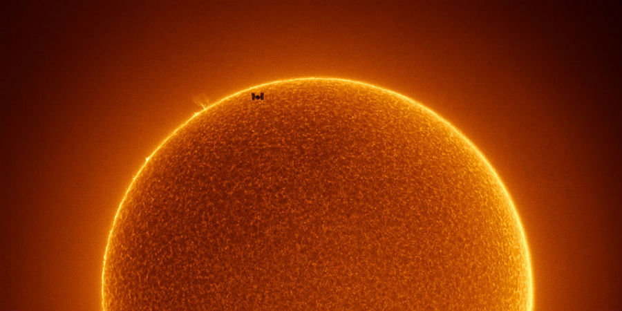 Die zwarte sproet linksboven op onderstaande foto is echter geen zonnevlek. Wat je hier ziet, is het ISS dat de zon passeert. De Amerikaanse Rainee Colacurcio legde het internationale ruimtestation vast. De foto is een compositie van verschillende belichtingen van de zon die zijn samengevoegd met een bewerkingsprogramma.