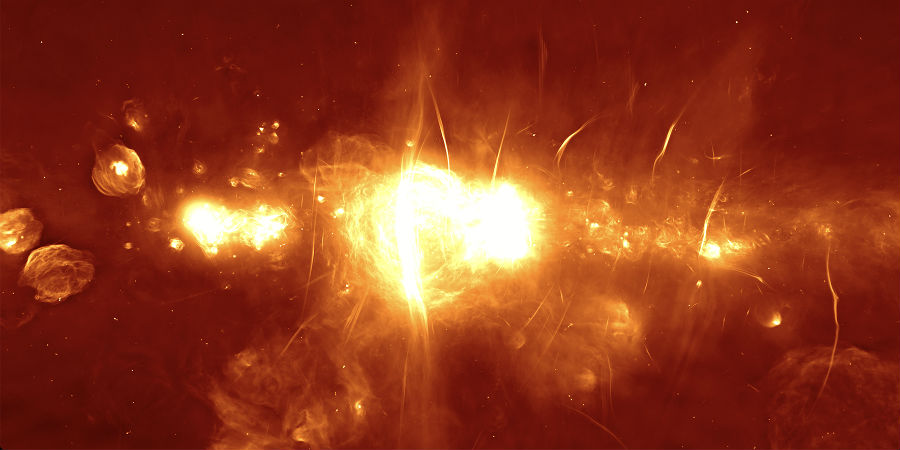 Om te vieren dat de MeerKAT is geïnaugureerd, werd namelijk deze foto van het Melkwegcentrum gepresenteerd. De opname is gebaseerd op waarnemingen van de radiotelescoop, waarbij expres voor deze kleuren is gekozen. Ze illustreren de helderheid van de radiogolven die door de telescoop zijn geobserveerd: een rode kleur staat voor vage emissie, terwijl oranje, geel en wit voor de helderste gebieden staan: